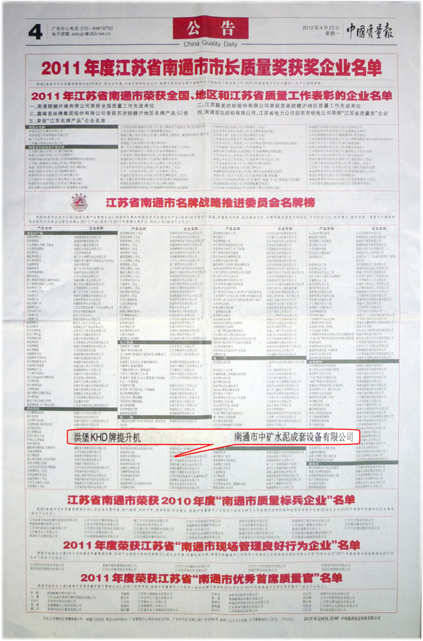 4月18日,南通市中礦水泥成套設備有限公司生產的“洪堡KHD牌提升機”被江蘇省名牌戰略推進委員會評為“江蘇省南通市名牌產品”。4月23日,“洪堡KHD牌提升機”產品上榜中國質量報專版第8版“江蘇名牌”榜和江蘇省南通市名牌榜。