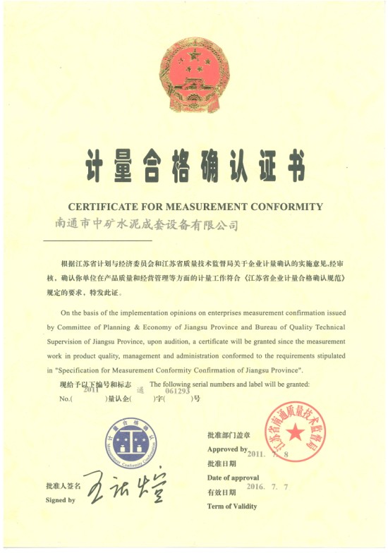 江蘇省質(zhì)量技術(shù)監(jiān)督局于2011629——30日對南通市中礦水泥成套設備有限公司進行計量認證評審。通過查看文件,現(xiàn)場觀察實驗以及設備的評定,南通市中礦水泥成套設備有限公司達到了《產(chǎn)品質(zhì)量檢驗機構(gòu)計量認證/審查認可(驗收)評審準則》的要求,并于201178日獲得了計量認證證書。計量認證為政府執(zhí)法部門打擊假冒偽劣商品提供了有力的技術(shù)保障,為審判機關(guān)裁決因產(chǎn)品質(zhì)量引發(fā)的案件提供了準確的技術(shù)依據(jù),為商業(yè)貿(mào)易雙方提供了公證的檢驗結(jié)果,為機械行業(yè)設備和工程項目出據(jù)了科學、準確、可靠的檢測數(shù)據(jù)。從整體上講,質(zhì)量認證、審查認可工作為提高產(chǎn)品質(zhì)量水平、全民質(zhì)量意識、國家建設做出了不可磨滅的貢獻。在產(chǎn)品質(zhì)量檢驗和檢測等領(lǐng)域《計量認證》列為檢驗市場準入的必要條件。