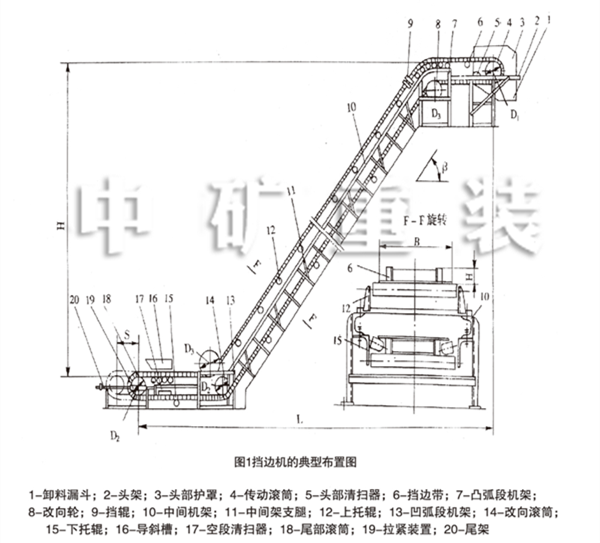 為了獲得較好的受料和卸料條件,在輸送傾角大于45°時,波狀檔邊帶式輸送機推薦采用“S”型和“SC”型布置型式,即檔邊機設(shè)有下水平受料段和上水平卸料段(見圖1)。